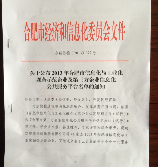以下為合肥市經(jīng)濟(jì)和信息化委員會(huì)頒發(fā)證書及紅頭文件: